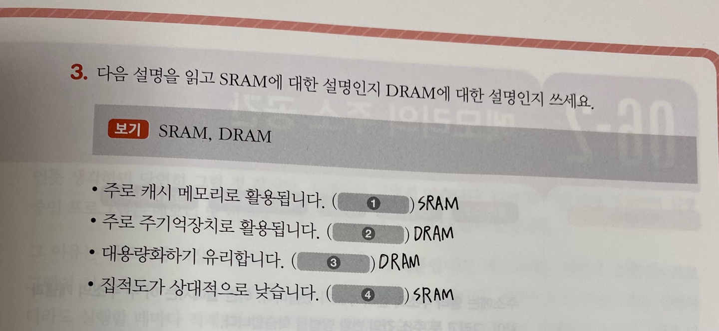 캐시 메모리 : CPU와 메모리 사이에 위치하고, 레지스터보다 용량이 크고 메모리보다 빠른 SRAM기반의 저장 장치