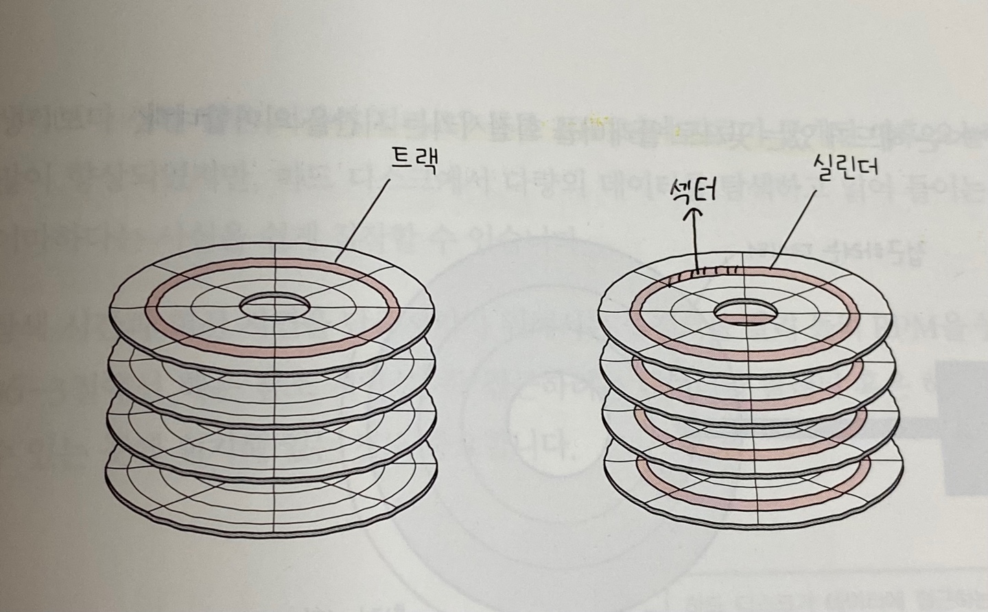 플래터는 트랙과 섹터로 나뉘고, 같은 트랙이 모여 실린더를 이룹니다.