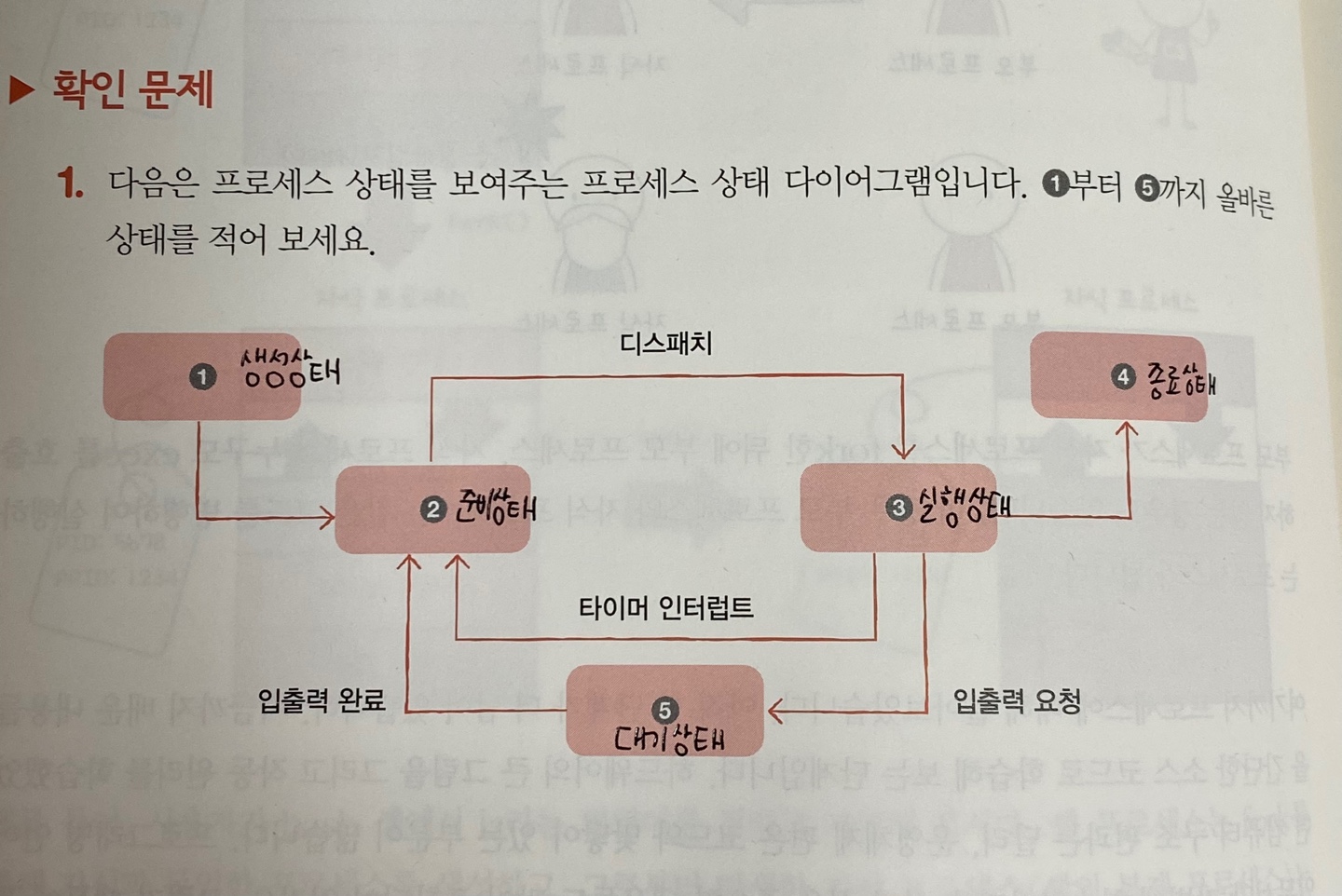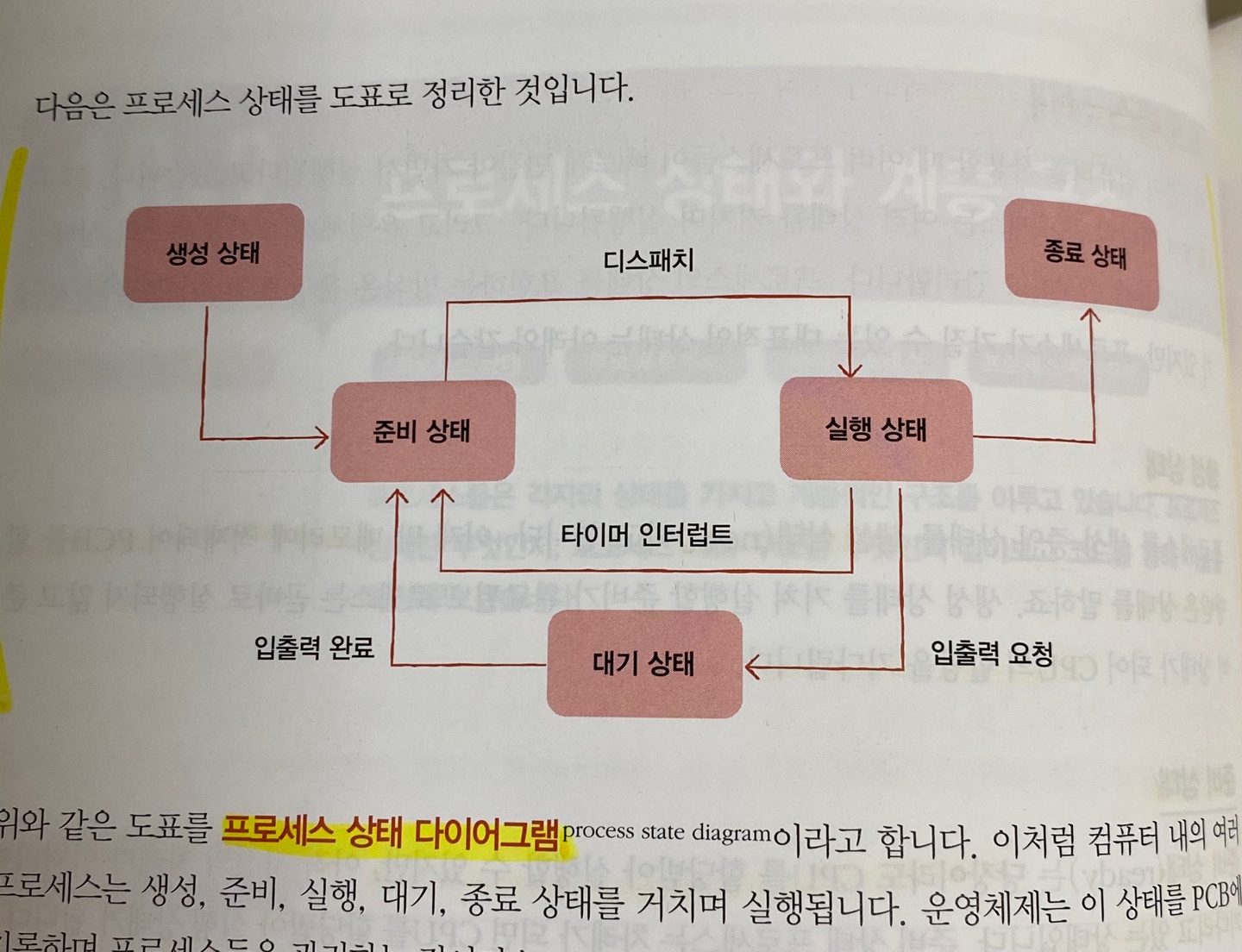 - 대기 상태 : 프로세스가 입출력 잡업을 하면 대기상태가 된다 (말그대로 대기하는 상황)