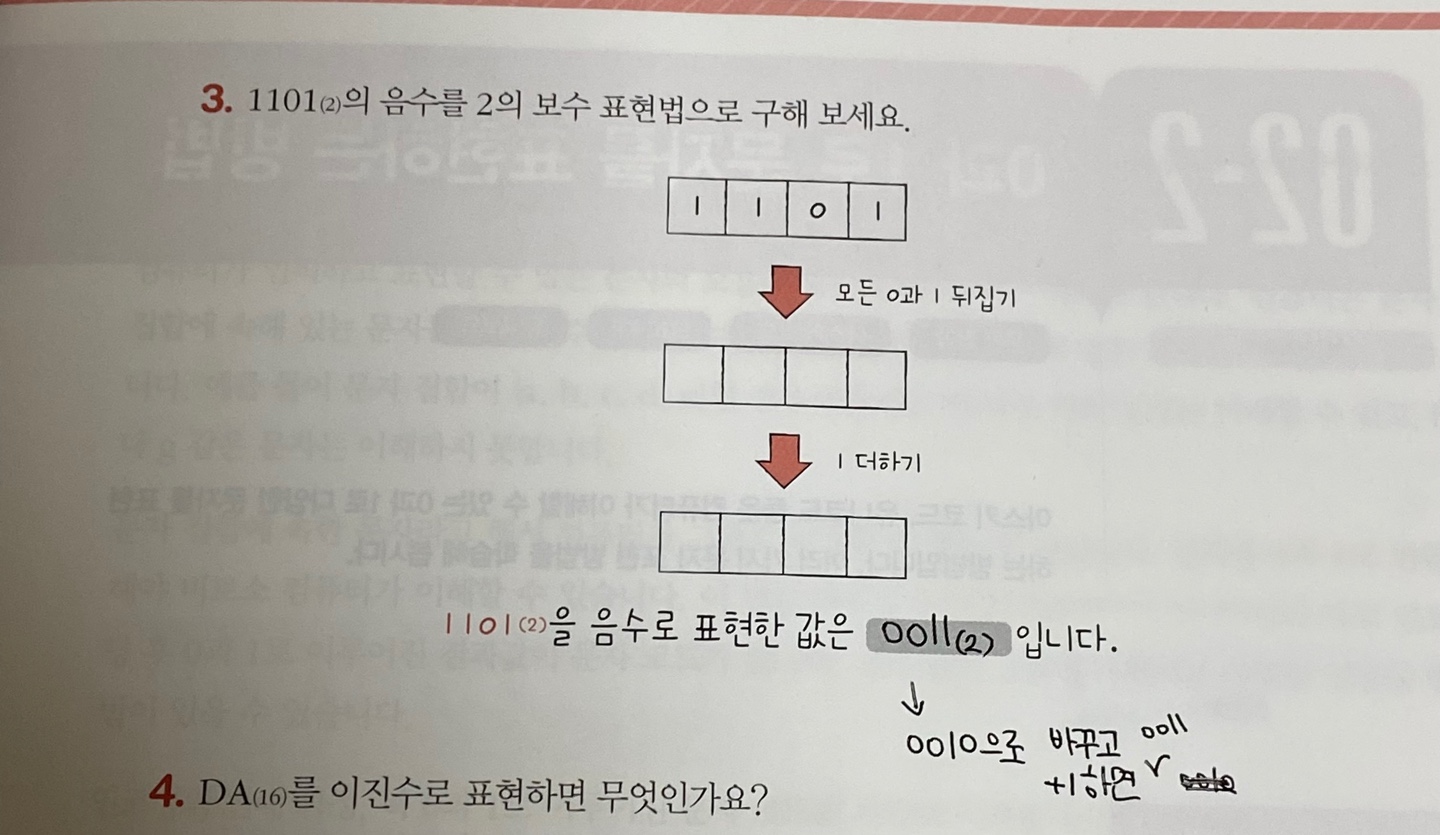 ex. 11 -> 00(모든 0과 1 뒤집기) -> 01(거기에 1을 더한) => 11의 보수 == 01